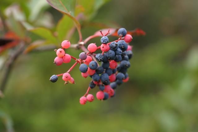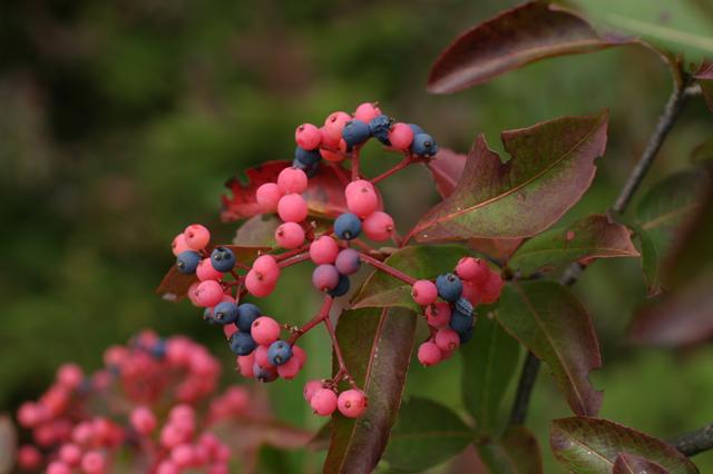 It features aromatic white flowers arranged in flat-topped clusters (cymes 2-5” wide) in May-June. Flowers are followed by clusters of ovoid berries that change color as they ripen, from light pink to deep pink to blue to purplish-black. The berries are highly acidic but edible. Elliptic to oblong-lanceolate glossy dark green leaves (to 4” long). Foliage sometimes turns an attractive maroon to dark red-purple in fall.