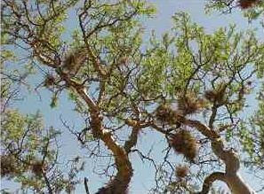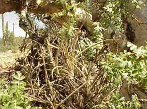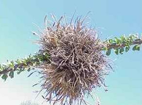 Despite its common name, "ball moss" is not a moss at all, but a flowering plant of the pineapple family (Bromeliaceae). It grows as an epiphyte on a wide range of plants in the central and western parts of the Baja California desert of Mexico, where winds from the Pacific Ocean carry moisture-laden air. It forms a tangled mass of leaves and aerial roots, which are dry and grey coloured for major parts of the year. But the leaves rapidly hydrate and turn green when exposed to moisture.