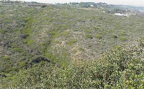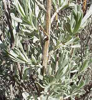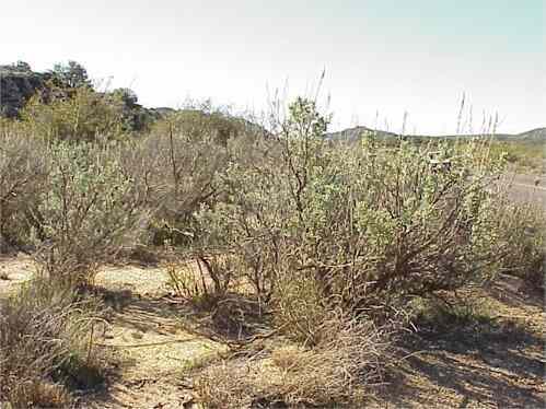 On dry rocky slopes, big sagebrush often occurs in mixed communities with other shrubs or small trees. An example of this is seen below, where a rocky hillside on the outskirts of San Diego (California) is covered with big sagebrush (grey-green areas), Ephedra species, and low-growing oaks (foreground and the brighter green areas) such as shrub live oak and emory oak GO TO: |