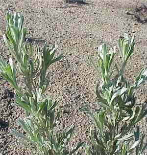 Big sagebrush Big sagebrush (Artemisia tridentata) is one of the most abundant desert shrubs. It dominates much of the Great Basin Desert in regions where the soil is not saline. In addition, this or closely related species of sagebrush extend southwards into California and the Baja California region of Mexico. The plants frequently grow to 1.5 metres height, with a pronounced woody stem. The leaves are wedge-shaped, greyish-green, hairy, strongly aromatic, up to 4 cm long and usually are held in upright clusters. Typically, the leaves are indented at the tip, with 3 or more blunt "teeth".