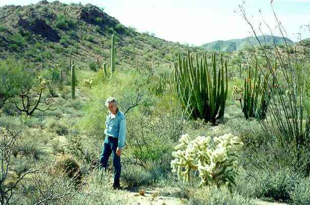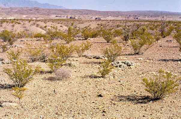 There is an interesting corollary to this: when we look at the structure of desert communities we find something quite different from the structure of communities in other biomes. In the wetter and more productive biomes the plants compete mainly for light. In fact, the most productive biome - tropical rainforest - has a vertically structured community of plants, with canopy trees, climbers, understorey trees and shrub and ground layers. Here the main factor is competition for light. A desert biome is entirely different from this because there is seldom, if ever, competition for light. Instead, the desert plants compete for water, and their usually wide spacing reflects competition of their root systems for water capture. If a patch of desert is cleared of vegetation then the same species will reappear, spaced out to exploit the available water, because these are the only species adapted to withstand the rigours of drought. What do these deserts look like? The answer is that they are extremely diverse. Vast tracts of them are extremely monotonous, like the hundreds of square kilometres dominated by creosote bush in the lower, drier parts of the Sonoran Desert (image below). But others have a much higher species diversity, like the somewhat wetter upland regions of the Sonoran Desert (second image below). SEE: DESERT GALLERY THEN GO TO: NORTH AMERICAN DESERTS