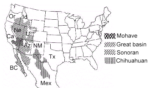 Compare the image above with the one below, and we see that some of the areas of lowest productivity match closely the areas of the main North American deserts. [Some of the other regions of low productivity in the satellite image are mountaineous areas - the Cascades-Sierra Nevada range to the west of the desert regions and the Rocky Mountain range to the east]