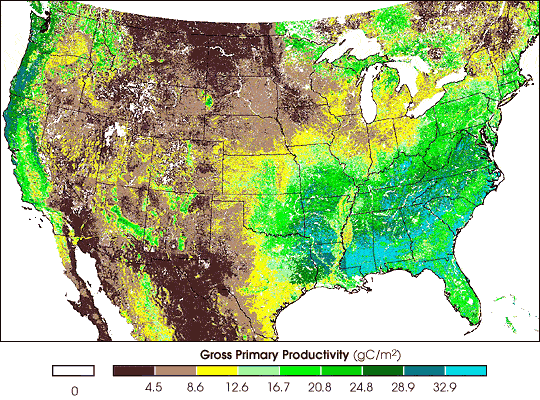 The sparseness of vegetation in deserts contrasts with the higher density of vegetation in wetter biomes. The effect of this is illustrated in the image below, which shows remote (satellite) monitoring data on the gross primary productivity (grams of carbon produced per square metre) in different parts of the USA.