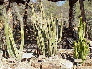 Another major family of leaf succulents - the Crassulaceae - are commonly known as the stonecrops. These are rosette-forming plants, which are not necessarily confined to desert regions - they even occur on rocky outcrops in cool parts of the world, including Britain. Physiological adaptations to drought conditions Plants that grow in dry environments face a major problem. In order to grow, they need to absorb carbon dioxide from the atmosphere and convert it into sugars (photosynthesis) by using energy obtained from light. Plants gain their carbon dioxide by opening small pores, called stomata on the leaf or stem surface. But opening of the stomata during the hot, daytime hours leads to loss of water from the tissues. The cacti and many other succulent plants have overcome this dilemma by using a special biochemical process called crassulacean acid metabolism (CAM) because it was first discovered in plants of the Crassulaceae family. Details of this can be found on another page, but basically these plants open their stomata by night, when the temperature is cool, and absorb carbon dioxide which they store by chemically combining it with an organic compound containing 3 carbon atoms, producing a 4-carbon organic acid. During the day, when the stomata are closed, the carbon dioxide is released from this organic acid and used to synthesize sugars, using the energy of light. These plants do exactly the opposite of normal plants, which open their stomata by day when light is available for photosynthesis, and close them at night. Some other plants of hot environments have developed a further physiological adaptation, called C4 metabolism, which contrasts with the C3 metabolism of most plants. This is found especially in many tropical and subtropical grasses, including those of the warmer deserts of North America. Details can be found on a separate page. Cacti as integral components of natural habitats Cacti may be fascinating organisms, but the question we will ask here is: how important are they as members of the desert community? How do they fit into the whole scene? The answer is that some of the larger cacti can be major components of the desert vegetation, and provide food and shelter for other organisms. The large cacti support a range of animals such as the specialised cactus bees (which use cactus pollen to feed their larvae), javelinas which each large amounts of prickly pear pads, and bats which depend on the nectar of cardon, saguaro and organ pipe cactus during their annual northern migration from southern Mexico into northern Mexico and Arizona. Fruits of the larger cacti provide food for many birds, while the plants themselves provide shelter and nest sites for woodpeckers and flickers, cactus wrens, curve-billed thrashers, owls and hawks, etc. Without these large cacti, there would be significantly less animal diversity. But the largest cacti are confined to the smi-tropical environment of the Sonoran Desert of North America and, apart from the chollas and prickly pears, the other deserts have much smaller cacti that are minor components of the total habitat. In fact, few (if any) cacti can be considered to be the primary determinants of desert communities, because almost all cacti depend on the shade and shelter of other plants in order for their seedlings to become established and to survive the early years of growth. The evidence of this is seen in the frequent occurrence of cacti under nurse plants, including the major nitrogen-fixing trees and sub-trees of the Sonoran Desert. This helps us to see the role of cacti in perspective, and to recognise the vital roles that other, less spectacular, plants play in the community structure of deserts. |