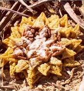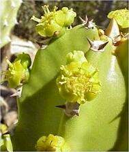 In place of leaves, cacti have special organs called areoles. These are like buds and they are arranged regularly along the ribs of the stem or on the tips of tubercles (see images below). They produce spines which help to protect the stems from being eaten by herbivores. In some cacti the spines are so dense that they almost completely obscure the underlying stems, shielding the stems from intense sunlight and preventing the plant from overheating. Range of form, and convergent evolution Even though we can instantly recognise most cacti as being cacti, they show a wide range of forms, each adapted to particular environmental and site conditions. For example, the large columnar cacti such as the saguaro and the cardon cactus are conspicuous and dominant plants in desert regions that experience relatively high rainfall (up to about 30 cm precipitation each year). These cacti contrast with the many smaller forms - often 5 - 15 cm tall - which are found in drier conditions. One of the most unusual of these is the living rock cactus of the Chihuahuan Desert (see image above). This cactus grows as a rosette of triangular, spine-less tubercles on arid limestone ledges, and stores both water and nutrients in a rather deep, turnip-like taproot. It blends perfectly with the limestone rock fragments of its habitat, so it is difficult to see - perhaps an adaptation to protect it from herbivores. Much of the range of form of cacti can be seen by going to the Cactus Gallery. Some other plants, quite unrelated to cacti, are stem succulents that have evolved features resembling those of cacti in order to cope with similar environmental conditions - a process termed convergent evolution. Chief among these plants are the African species of Euphorbia (the spurge family: Euphorbiaceae). For example, the image on the left below shows three plants, but only the plant on the extreme left is a cactus - the "old man" cactus of the Sonoran Desert. The other two plants are Euphorbia species from Africa. The third of these plants even has thorns (see the close-up image on the right) but they are not like the spines of cacti. When we look at the flowers it becomes obvious that they are in a different family - the flower structure is typical of Euphorbiaceae.