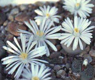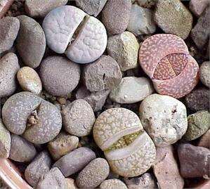 Several other large plant families have developed fleshy, succulent leaves to cope with periodic drought conditions, and they bear a superficial resemblance to cacti. These plants are called leaf succulents, rather than stem succulents. One of them is the mesembryanthemum family, and it includes the remarkable living stone plants (Lithops species) of the South African and Namibian Deserts (images below). These plants characteristically grow among pebbles on the banks of dry river beds, where they are perfectly comouflaged and where they receive periodic water when the river beds fill after rains. Each plant consists of a pair of fleshy leaves, exposed only at the surface, where the photosynthetic tissues are located beneath the patterned "windows" (see Living stones). They produce white or yellow daisy-like flowers in summer, then the old pair of leaves shrivels while the water and nutrients within them are absorbed by a new pair of leaves (or occasionally two pairs) which emerge from the gap between the old leaves.