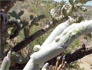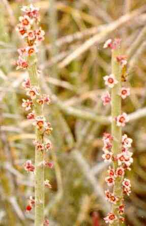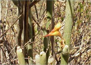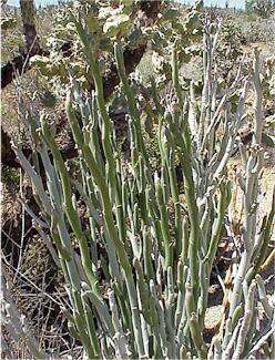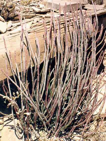 Pedilanthus macrocarpus (slipper plant) This Sonoran Desert species of the Baja California peninsula is larger and more robust than the Chihuahuan Desert candelilla. It often grows to 1 metre height, with thick, bracnhed stems (about 2 cm diameter) that have a thick waxy coating, giving them a white sheen. If the stems are damaged they exude a milky fluid (as do many other plants in the euphorbia family). This plant most often is seen growing in the partial shade of cacti or shrubs. Its flowers are borne in clusters near the tops of the stems. Each cluster contains a single female flower surrounded by many male flowers that resemble a slipper - hence one of the common names for this plant is the slipper plant. The following images are clickable, for a larger version.