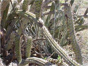This Chihuahuan Desert species was once common over much of northern Mexico and extended into southern Texas. Candelilla (meaning "little candle") is an apt name for this plant, which forms clusters of thin (about 1 cm), straight, wax-covered stems on gravelly flats and rocky ledges. It is leafless for most of the year but photosynthesizes through the stems. It produces many small, pink flowers on the upper parts of the stems. The plant has traditionally been harvested from the wild, to extract the thick wax coating, which can be used for making candles, wax polish, etc. Over-harvesting has seriously reduced the populations of this once-abundant species. The species name "antisyphilitica" refers to the folk belief in Mexico that the plant can be used for treatment of venereal disease.
