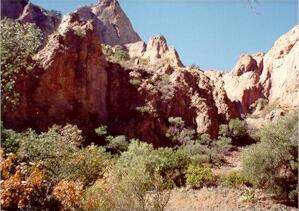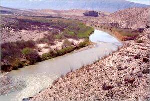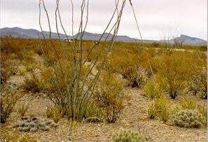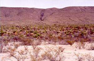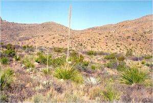 The relatively high rainfall and cool winter temperatures result in a vegetation often dominated by grasses and frost-tolerant plants such as agaves and yuccas. There are no large columnar cacti, except in the more southerly regions of Mexico, but there are many small and interesting cacti that prefer lime-rich environments. This page describes the main features of the Chihuahuan Desert, including the changes that occur with increasing elevation. Other pages describe the unusual cacti and other characteristic plants of the Chihuahuan Desert. The major vegetation types The Chihuahuan Desert shows very clear changes of vegetation as we move from the lower lying regions to increasingly higher elevations. These transitions are dictated partly by changes in soil factors and partly by changes in temperature and rainfall. In the lower-lying, flatter areas the soils are typically sandy or gravelly, overlying a compacted layer of caliche. These soils retain little water and often are dominated by creosote bush, either growing alone or mixed with other drought-tolerant plants such as ocotillo, hedgehog cacti and a small yucca called lechuguilla (image 1 above). However, in some places, creosote bush can be co-dominant with tarbush, another drought-tolerant shrub that prefers calcareous soils. Both lechuguilla and tarbush are characteristic plants of the northern parts of the Chihuahuan Desert. Beyond the flatter regions, the land slopes gently upwards to form bajadas, where the debris from mountain erosion accumulates as a mixture of small rocks, stones and smaller soil particles. These soils are deeper and enable water to penetrate further into the soil profile because of their mixture of particle sizes, so that the less drought-tolerant plants predominate. On the bajadas, creosote bush is rapidly replaced by a community dominated by tree-like species of Yucca, such as Torrey yucca or banana yucca (image 2 above). These yuccas are difficult to distinguish from one another because of hybridisation, and frequently are grouped under the common name of Spanish daggers because of their sharply pointed leaves. They are drought-tolerant plants, with thick leaves and they are quite frost-tolerant. With ascending elevation the typical desert community is replaced by desert grassland, which often includes a conspicuous plant called sotol, or desert spoon (image 3 above). In some ways this plant resembles a yucca, but it does not have fleshy leaves and its flower structure is quite different. As we move even higher into the mountain canyons, the desert grassland is replaced by desert scrub, including bushes and small trees such as shrub live oak, mormon tea and jojoba (image 4). These plants grow in the deep alluvial fans created during hundreds of thousands of years of mountain erosion (image 5) and in the shelter of the mountain crags (image 6) where the temperature is cooler and water is more abundant than in the valley floors. However, such differences on a grand scale do not give a complete picture, because there are many subtle variations in the plant communities. For example, a narrow zone of reeds and willow trees lines the Rio Grande (image 7, below) but immediately beyond this is an extremely arid zone where many unusual plants grow on the shallow soils of a limestone pavement. These plants include the limber bush (image 9), resurrection fern (image 10) and candelilla, from which wax has traditionally been extracted for making candles. Where the soil is exposed within the limestone pavement there is a complex microbial crust (image 11) - a vital community of lichens, fungi and cyanobacteria that, over tens, hundreds and thousands of years, contribute to the soil-forming process. Some of the extremely dry limestone ridges (image 8) support an unusual range of cacti found nowhere else, such as the living rock cactus and Bokes button cactus (image 12).