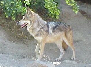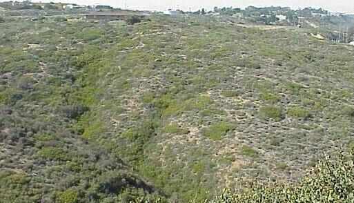 The coyote is like a medium-sized dog with a long, bushy, black-tipped tail, prominent ears and a pointed muzzle. It differs from domestic dogs of equivalent size by having very small paws. It is omnivorous, eating carrion, cactus fruits, etc., and it hunts small animals. It is a social animal, found in small family groups in many desert regions, and is active mainly at night or early morning. Coyotes are widespread in the USA, but are more often heard than seen - the characteristic night-time howling of family groups is a characteristic sound of the desert. In many lowland parts of the USA, the coyote is a "top predator". Such animals need a large home range in order to forage for food, but increasing urbanisation in some of the desert regions is causing fragmentation of the habitat with interesting and perhaps unexpected ecological consequences. A classic example of this was reported in a recent scientific paper [Crooks, KR & Soulé, ME, 1999, Nature 400, 563-566]. These authors studied the effects of urban development in native sage-scrub habitat of coastal Southern California - the sort of habitat shown below.
