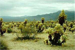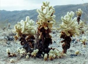 Joshua trees can still be found at these middle and lower elevations, but in the flatter valleys the vegetation is often dominated by creosote bush. Some of the shallow, sloping hillsides can be dominated by pure stands of teddy-bear cholla, which propagate vegetatively, when the stem segments fall to the ground and take root, as shown in the images below. One other important feature of the Majoave Desert is the large number of spring annuals, which appear quickly after the winter rains and carpet the desert floor following their flowers. There are about 250 different spring annuals in the Mojave Desert, and about 80% of these are endemic - unique to this desert region. This contrasts with the Great Basin Desert, where there are few spring annuals.
