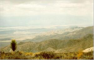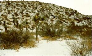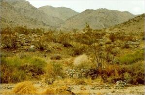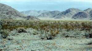 Descending from the higher regions of the Mojave Desert towards the Sonoran Desert, the vegetation changes progressively. Creosote bush becomes more common - either mixed with grasses and low-lying shrubs, or as nearly pure stands.