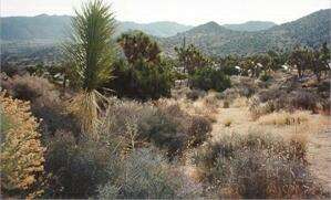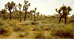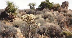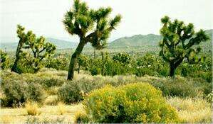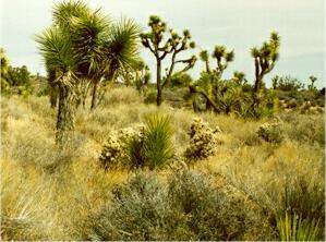 [Click on images for a larger version] The Mojave Desert is difficult to define in biological terms because it covers a wide range of different vegetation types, elevation and climate. The more northerly sections of this desert resemble the Great Basin Desert, being dominated by low-growing, drought-tolerant shrubs. In contrast, the lower-lying southern sections of the Mojave Desert contain extensive tracts of creosote bush, resembling the Sonoran Desert. In another region of this desert - Death Valley - the vegetation is extremely sparse because of the very hot temperatures and sparse rainfall (average 4.3 cm per year). Yet the Mojave Desert has some distinctive features that make it biologically interesting. This desert is characterised by having several species of Yucca - a genus largely absent from the Great Basin and Sonoran deserts but which also occurs abundantly in the Chihuahuan Desert. One of these yuccas - the Joshua tree - grows to tree-like proportions and its distribution largely defines the boundaries of the Mojave Desert. Other species of Yucca - the blue yucca and majove yucca, which typically grow to less than 2 metres height - are commonly found in desert shrub communities with a range of drought-tolerant flowering shrubs in the higher and more northerly regions of the Mojave Desert