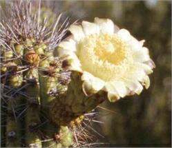 The older plants flower annually, producing large white blooms which open at night and close the next day. The many buds near the tops of the stems open on different days, so the flowering season can last several weeks. The flowers are pollinated mainly by bats.