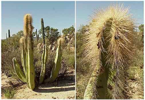 (Lophocereus schottii) The old man cactus (senita) can grow on rocky hillsides but grows mainly on dry alluvial plains in the desert regions of mainland Mexico and the Baja California peninsula of Mexico (where this photograph was taken). Small populations also occur in the extreme south of Arizona, but its northern limit is dictated by frosts that can occur on the flat sites where it grows. It is a large columnar cactus, branching at the base, and can reach a height of 3-4 metres. It has relatively few (5-8) widely-spaced ribs. One of the most distinguishing features is that the tips of the mature, taller stems are covered with long, hairlike, grey spines.