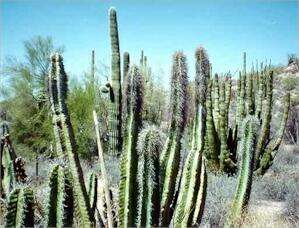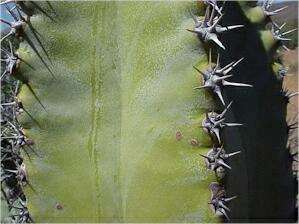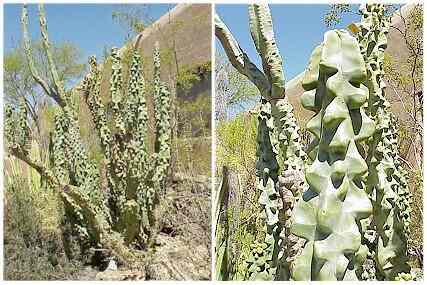 In contrast to the long spines at the tips of mature stems, the juvenile stems of senita have only short, stiff clusters of spines (see close-up above). This photograph also shows the waxy bloom on the surface of the stem. Senita has recently been found to have a mutualistic association with a moth, which pollinates the small flowers and lays its eggs in them so that the larvae can develop by feeding on the fruit tissues. This relationship closely resembles the widely known example of moth pollination of yucca species. Mutant growth forms Cacti occasionally show abnormal growth forms - called "monstrose" forms, uncharacteristic of the species. An interesting example of this is shown below, where the senita cactus has a genetically stable variant form. Instead of the ribbed stems of a normal senita, these plants have raised tubercle-like swellings along the stems, and few (if any) spines. This growth form of senita is sterile and yet, interestingly, it occurs naturally in at least two wild populations in Baja California. In these two locations the plants persist because stem sections break off periodically and root to produce new plants. Other examples of monstrose growth forms can occur in the Saguaro and the Cardon cactus. GO TO: |
