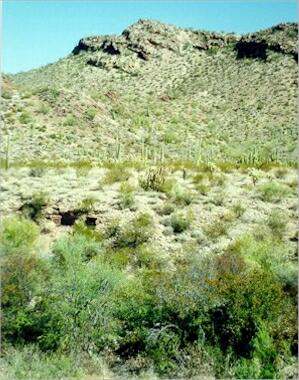 Bajadas support a rich diversity of plants because the soils are quite deep, with a mixture of particle sizes ranging from fallen rocks to gravels, sands and silts. The open structure of these soils enables water to penetrate and be retained deep in the soil profile, whereas the more tightly packed soils of flatter regions become saturated easily so that most of the water runs off them during heavy rains. The plant transitions in these sites are very obvious. For example, in the right-hand image above, a mixture of creosote bush and bursage in a flat, sandy or silty area is replaced within a few metres by a range of tall, columnar cacti, ocotillo, several cholla cacti and foothills paloverde as the land rises up a bajada. Two further examples of this sort of transition are shown below.