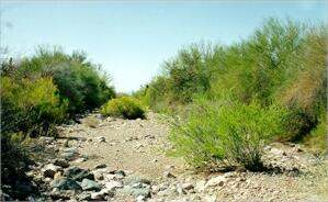 A further level of species diversity is provided by the river beds (washes) that periodically carry large amounts of drainage water from the surrounding mountains. Even though these washes are dry for most of the year, the moisture tends to be retained in the soil. Lining these washes is a range of shrubs, trees, and smaller flowering plants that benefit from the soil moisture content. They include mesquite, acacia, hopbush, paloverde, mexican jumping bean, chuparosa, canyon ragweed and Parry's penstemon.