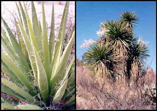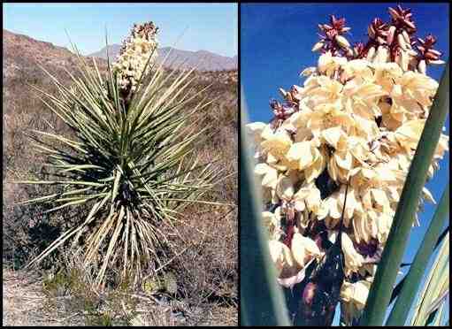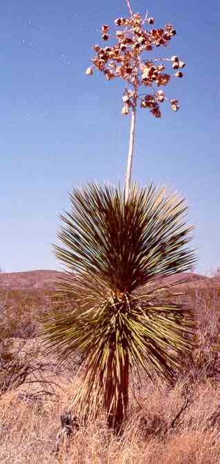 This mutually beneficial arrangement is so tightly regulated that Yucca plants abort their fruit development if the moth lays too many eggs in the ovary. This ensures that at least some viable seeds will be produced each year, while some also will be eaten by grubs, so that the survival of both mutualistic partners is maintained. Joshua trees (Yucca brevifolia) forming a dominant tree-like "forest" over a grassland zone in the Joshua Tree National Park, USA. Although they look "woody", the stems of these trees do not have annual rings; instead they are fibrous and are coated with the remains of dead leaves.The leaves are short (about 30 cm long) and densely clustered near the tips of branches. Some of the Joshua trees in this image have the remains of flower stalks. The growing point dies after flowering, and a new growing point emerges as a branch beneath this. Thus the trees become progressively more branched with age. Individual trees can live for perhaps 200 years or more. Soaptree yucca (Yucca elata), characterised by its narrow leaves and erect flowering spike. The plant shows the remains of the fruit capsules from the previous flowering season. Soaptree yucca gains its name from the high content of saponins in the trunk and roots. These soap-like compounds were used for shampoo and soap by indigenous Indians. Left: Stiff, spine-tipped leaves of banana yucca, with white fibres caused by shredding of the leaf margins. In the past, yucca fibres have often been used by indigenous Indian tribes for making mats, baskets, cloth, rope and sandals. Right: Clump of Schott's yucca (Yucca schottii), commonly termed Spanish bayonet. This species has lance-shaped leaves up to 90 cm long, and can grow to a height of 5 metres. It is found mainly on hillsides and in canyons at high elevation (4000 to 7000 feet). Banana yucca (Yucca baccata), showing the cluster of sweet-smelling, creamy-white flowers (photographed in May). Yuccas leaves are a major source of fibres for basket-making and other types of weaving by native American people. These fibres are clearly seen in the shredded outer margins of the leaves in the image above. Go to: |