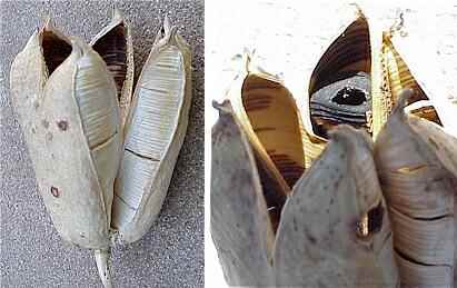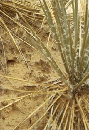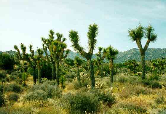 SPECIES All yuccas are in the Agave family (Agavaceae). They have stiff, succulent, perennial leaves and produce creamy-white, waxy flowers. They are found in the higher elevations of many of the North and Central American deserts, and are tolerant of cold winters. The many species of Yucca are difficult to distinguish from one another, but some are highly characteristic. The largest yucca is the Joshua tree (Yucca brevifolia), which has much-branched stems and can grow to a height of 10 to 15 metres. This plant is highly characteristic of the Mojave desert: its distribution largely defines the boundaries of this desert. Other characteristic species shown here are soaptree yucca (Y. elata), banana yucca (Y. baccata) and Spanish bayonet (Y. schottii). All yuccas have a highly characteristic means of pollination by female yucca moths of the genus Tegeticula. This is a truly mutualistic association, benefitting both the plant and the moth (which depends on yuccas for its survival). After mating, the female moth gathers pollen from the yucca flowers then flies to a different yucca plant and lays her eggs in the ovary of the flower. Then she inserts a ball of pollen into a special depression in the stigma of the flower, to ensure that the flower is fertilised. This pollination system is so precise that only yucca moths can pollinate these plants - yuccas grown in regions where the yucca moth is absent will never produce seeds unless the plants are hand-pollinated. After fertilisation, the seeds develop within the flower's ovaries. At this stage the eggs of the moth hatch and the young larvae feed on the seeds, eating their way through some of the columns of seeds (see below).