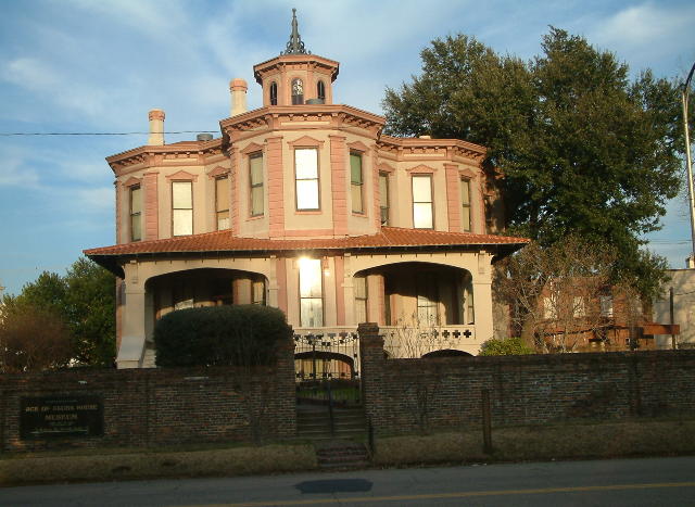 This unique Italianate-Victorian style structure features a floor plan inspired by Captain Draughon's lucky card. Three octagonal and one long rectangular room are arranged around a central octagon, which serves as the rotunda of the home. In the late 1890's, the Moore family added a bathroom wing and a kitchen wing. The Moore family also replaced the original iron galleries with a Spanish Revival porch in the 1920s.