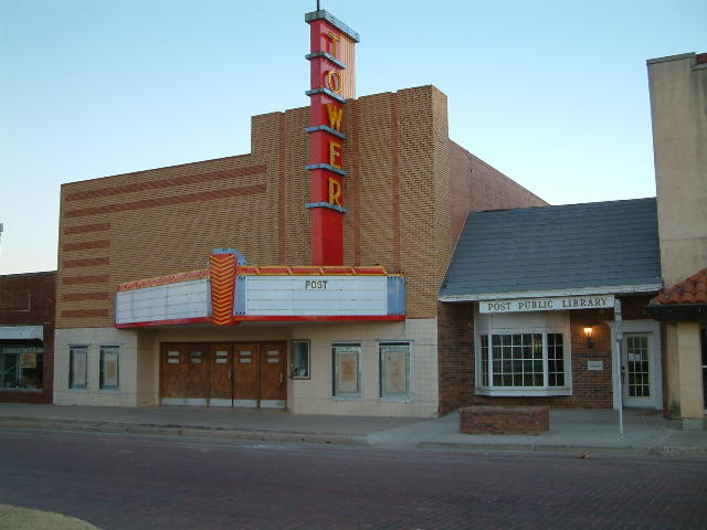 This theater seems to be home to a group calling themselves the 'Post Opry'. The marquee and sign have an attractive red and yellow pattern. The marquee is unfortunately missing most of its neon. The yellow brick facade is boxy but interesting with a stepped design and orange brick accents.