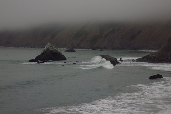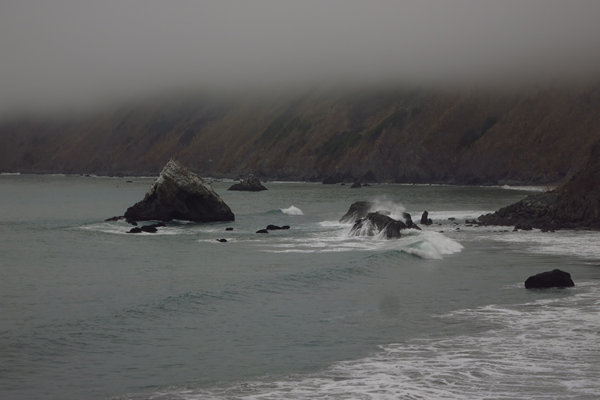 After the 20 mile twisty-turny and nicely wooded drive from Legget to the coast we popped out of the woods and almost immediately came to a big pull-off with a beautiful view of the ocean and shoreline.