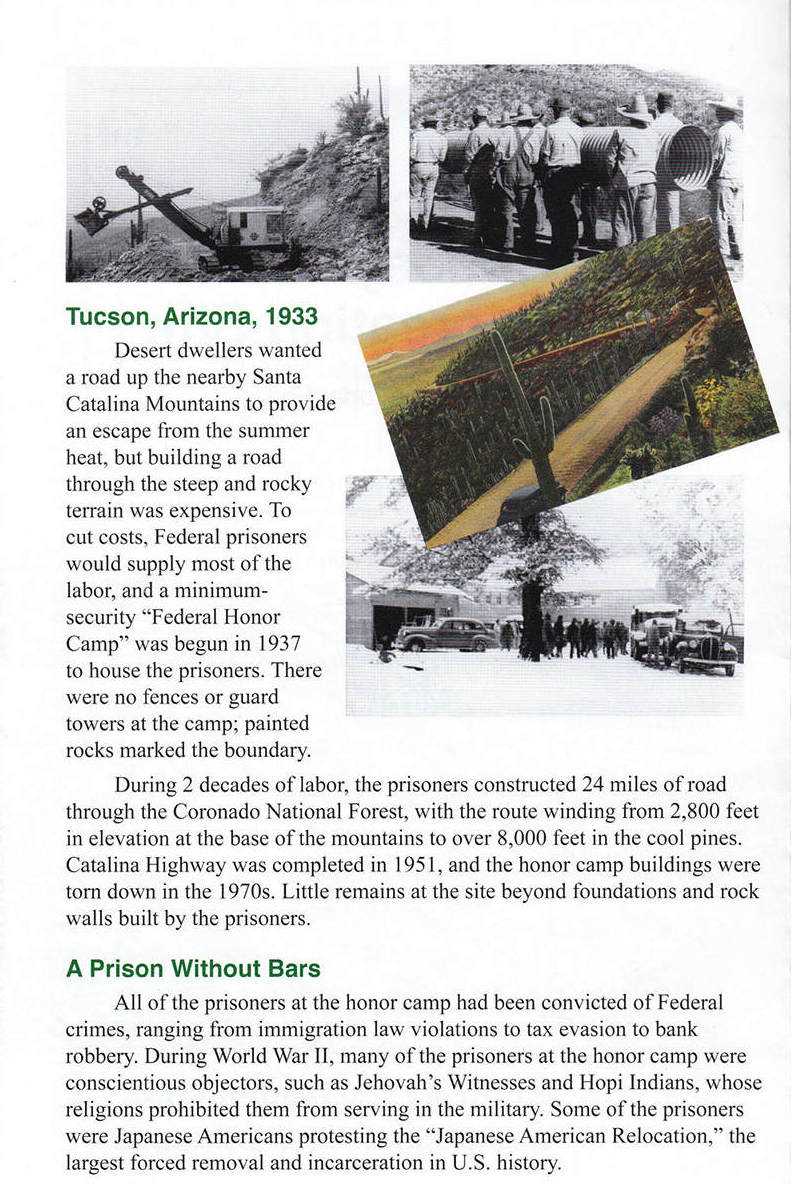 The name Prison camp came from the Federal Honor Camp begun in 1937 to house federal prisoners supplying labor to build a road providing access into the Santa Catalina Mountains. Prisoners had been convicted of federal crimes ranging from immigration law violations to tax evasion to bank robbery.