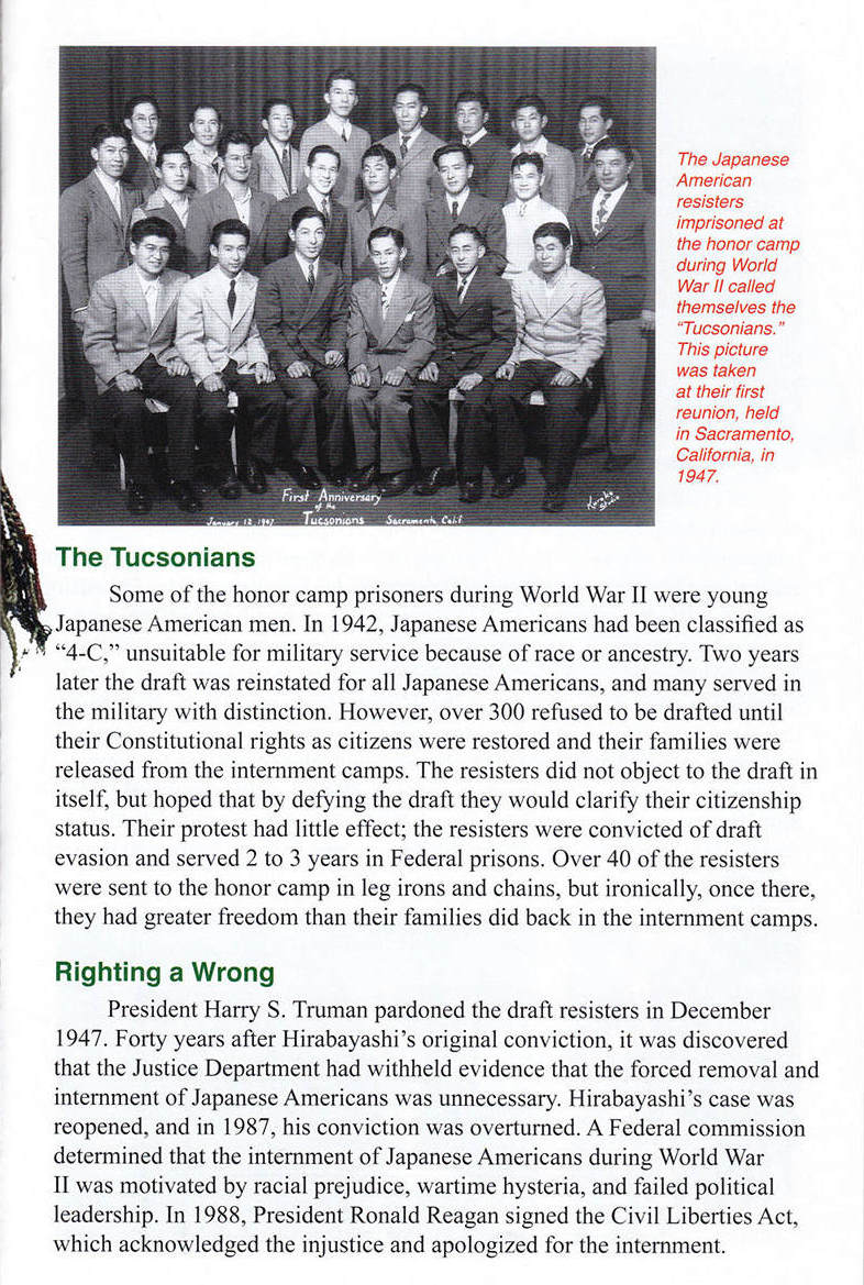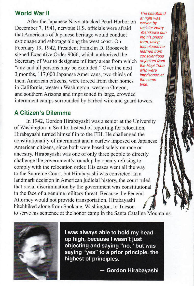 Gordon Hirabayashi was a senior at the University of Washington in 1942. He challenged the constitutionality of internment based on race or ancestry. He turned himself in to the FBI rather than report for relocation. He was convicted and sentenced to serve at the honor camp in the Santa Catalina Mountains.