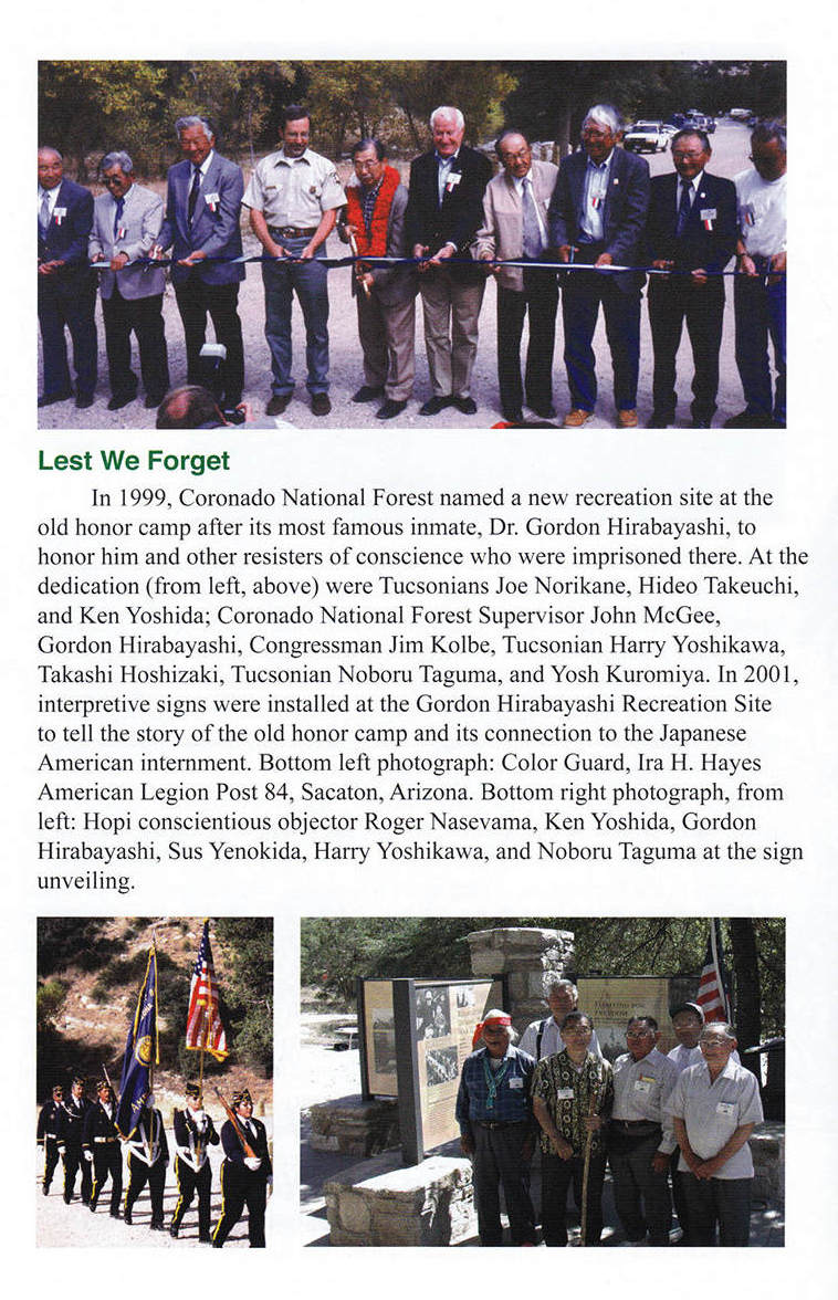 In 1999 the Coronado National Forest renamed the site in honor of Dr. Hirabayashi and the other resisters of conscience who were imprisoned there. Dr. Hirabayashi and others attended the dedication ceremony.