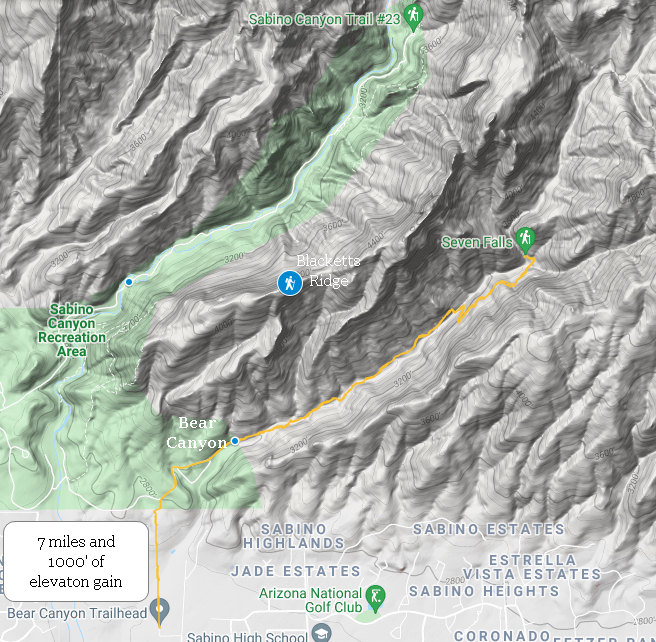 In the Catalina Mountains there are many fine hikes. One of the most popular is the hike up Bear Creek Canyon to Seven Falls.