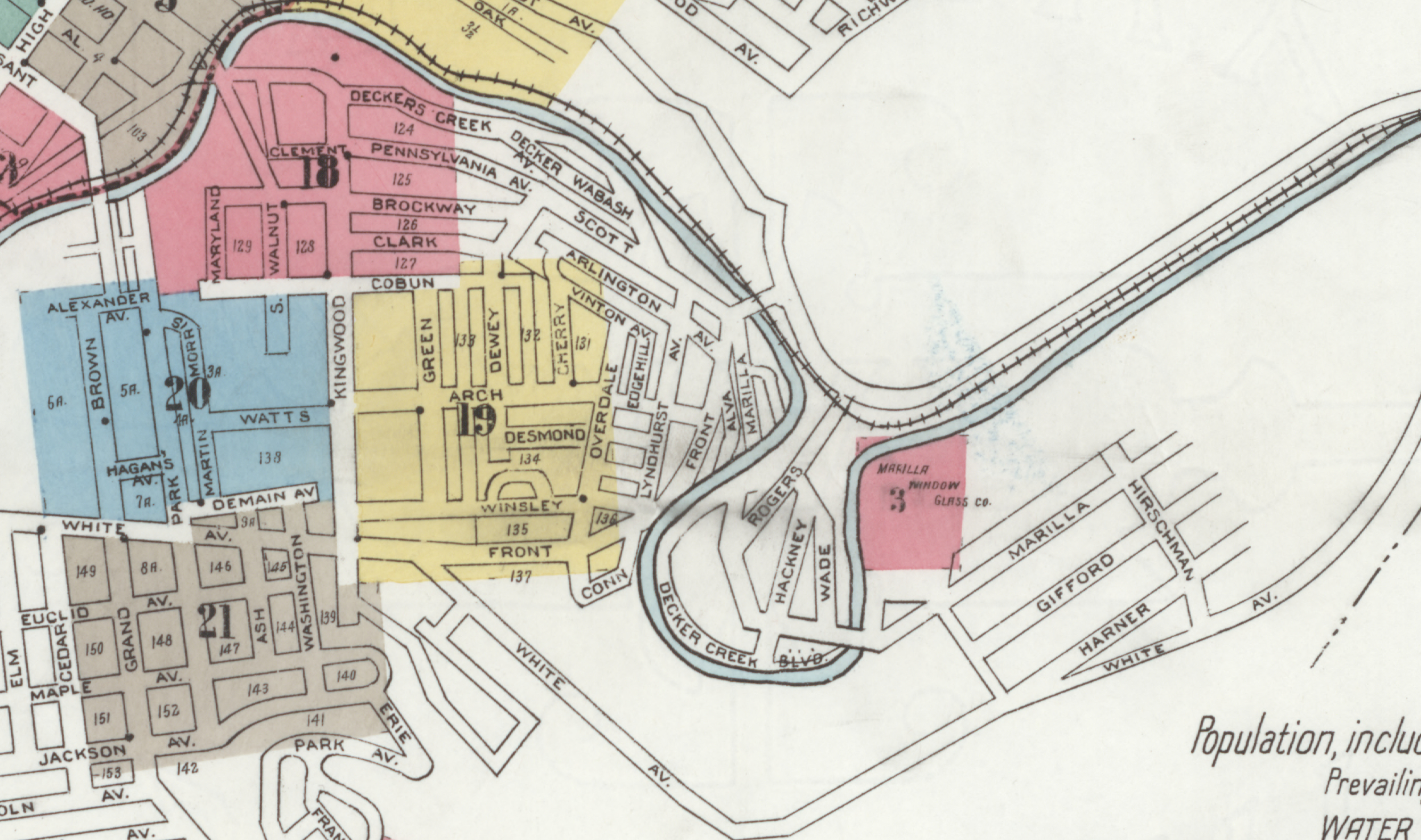This is the only photo I could find that gives an indication of the former course of Deckers Creek. The view is looking south from near Powell Avenue. The factory is the Marilla Window Glass Company, whose location is shown on the previous image. The houses on the hill in the background are on White Avenue. The date of the photo is unknown. If a photo were taken from this location today the creek would be shown flowing straight across the bottom of the photo.